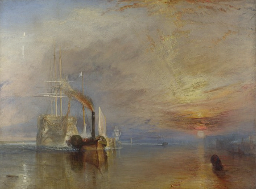 터너가 좋아했던 그림 중 하나로 영국 해군의 전함을 기념하며 그린 그림이다. 붉은 태양은 테메레르 호를 비추고 있고 차가움과 따뜻함이 대비가 되는 그림이며, 과거와 미래에 대한 대비도 돋보인다. 하늘은 흐릿하게 표현이 된 반면 배는 아주 세밀하게 표현한 것도 다른 특징이다. 실화의 작품으로 서정적이고 슬프면서도 애틋함이 묻어난다. 실제 이 배는 낮에 도착했지만 터너는 일몰을 그림에 담고 있고 그래서 마지막을 더 극적으로 표현해 내었다고 생각한다.